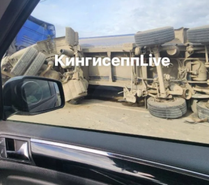 На "Нарве" большегруз прилег на отбойник и потерял содержимое кузова