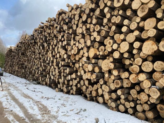 Спецтехника приехала к стихийному складу древесины в Гатчинском районе Ленобласти. Дорожные службы подсчитывают ущерб от заготовок бизнесменов, которые хранят бревна на обочинах.