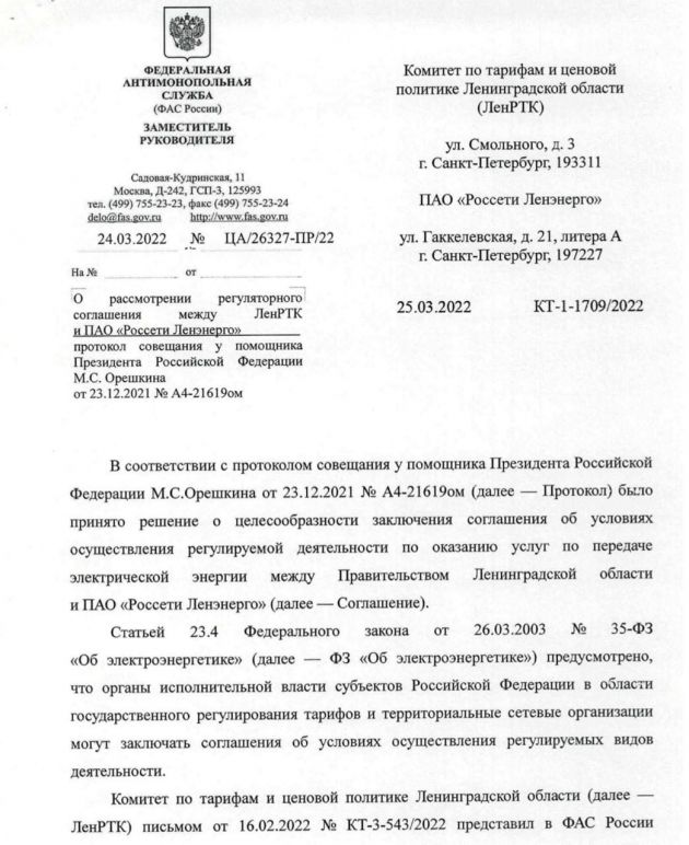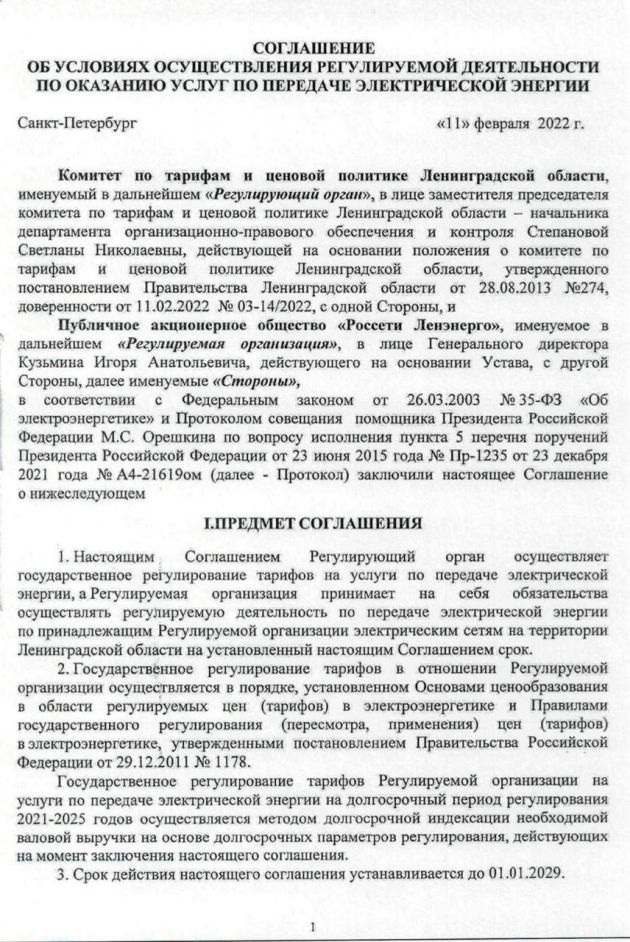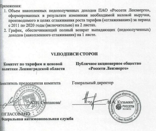 11 февраля на документе поставили подписи гендиректор Ленэнерго Кузьмин и зампред областного комитета по тарифам правительства Ленобласти Степанова.