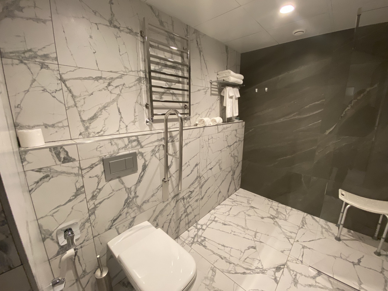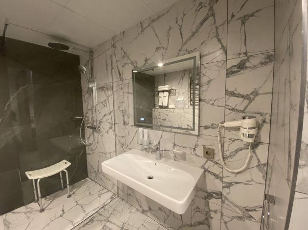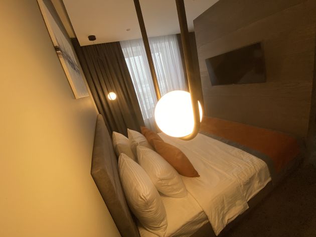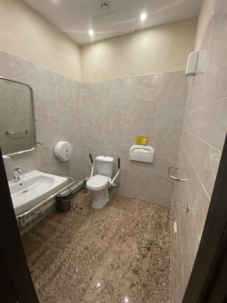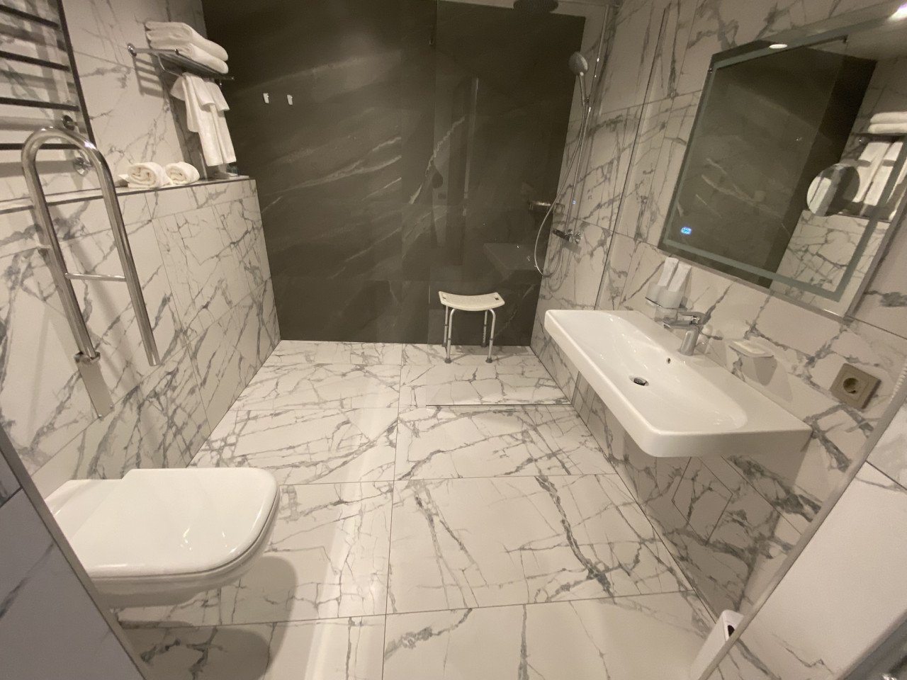 У кровати возник вопрос о жесткости матраса. Речь не о прихоти постояльцев, а о ежедневных физиологических особенностях. Администраторы успокоили — мол, пробовали сами, жестче не бывает. Из-за тех же нюансов и кровать пониже, а дверные проемы шире стандартных и без порогов.