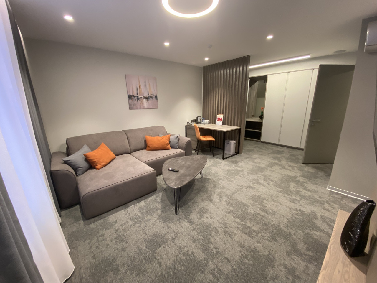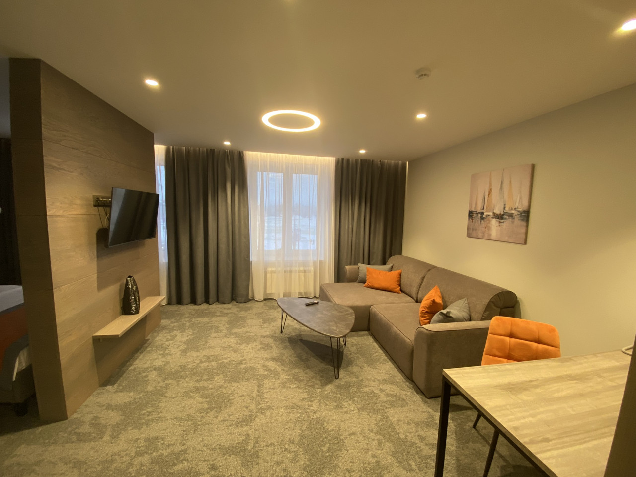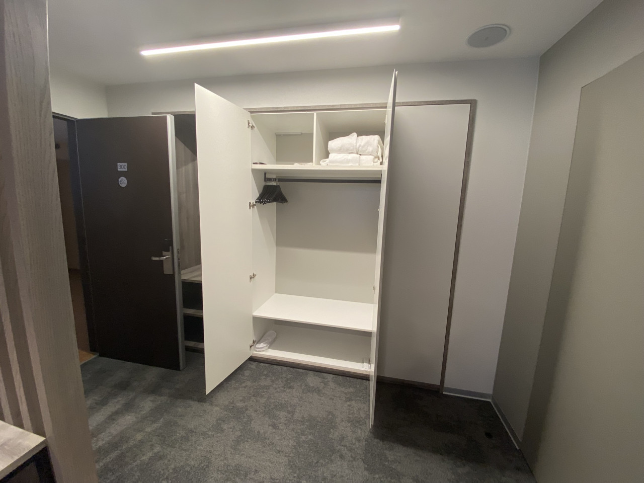 У кровати возник вопрос о жесткости матраса. Речь не о прихоти постояльцев, а о ежедневных физиологических особенностях. Администраторы успокоили — мол, пробовали сами, жестче не бывает. Из-за тех же нюансов и кровать пониже, а дверные проемы шире стандартных и без порогов.