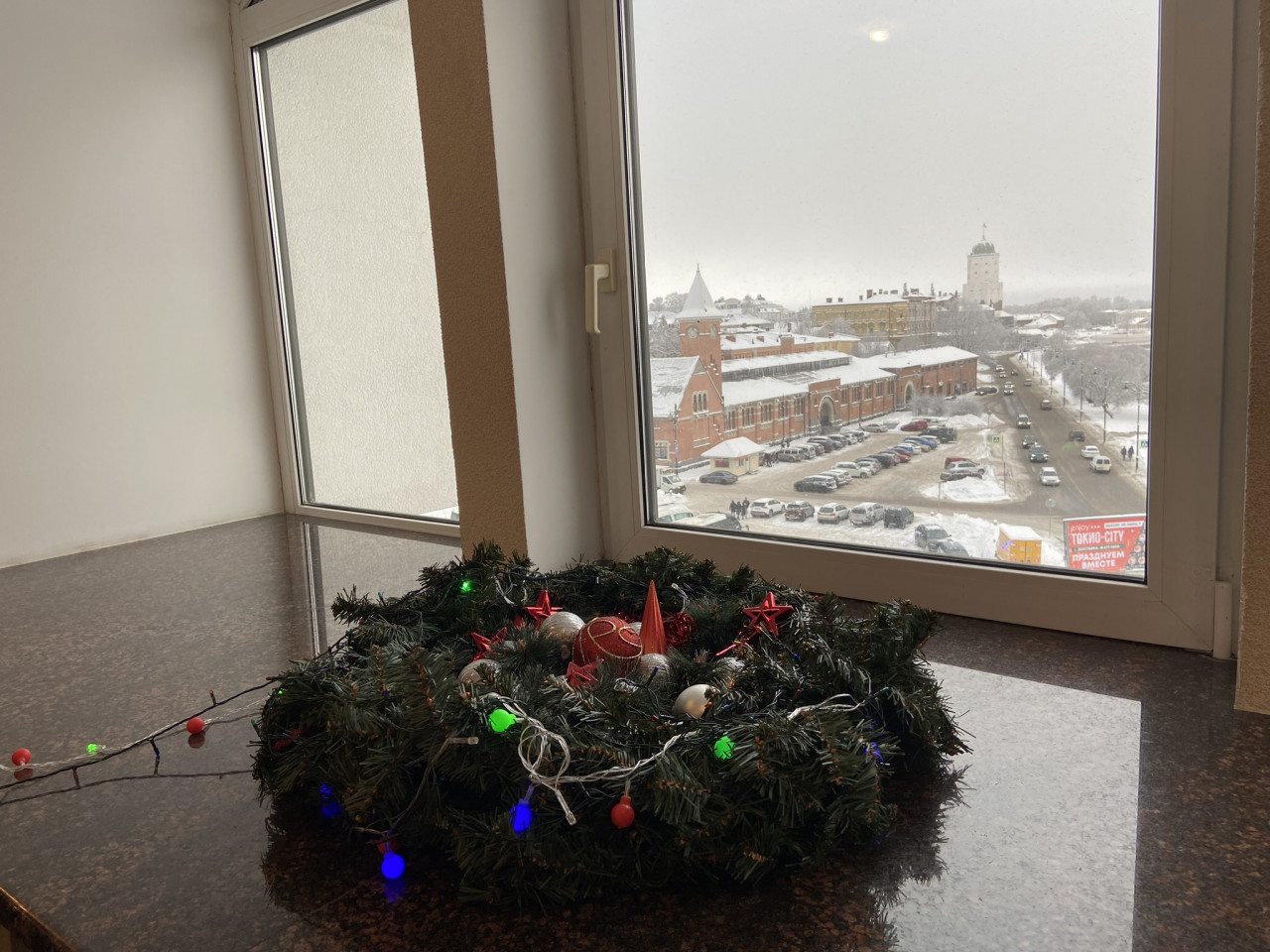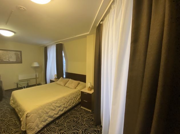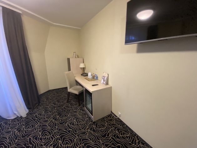 Он на предпоследнем, шестом этаже отеля. Туда-обратно возят два лифта, в кабине помещаются по четверо взрослых и коляска. На самом этаже, на площади под 20 квадратов дизайнерская мысль отразилась в мягких пастельных тонах. По левую руку — шкаф во всю стену, направо — гостиная с мягким диваном, столиком и телевизором. За перегородкой — двуспальная кровать с несколькими вариантами подсветки. Из окна — лучший вид на этот город, то есть на Рыночную площадь и замок. Николай же указал отельерам на практичное. В уборной — стены белого мрамора и складной поручень у унитаза, но стеклянная перегородка таит опасность.