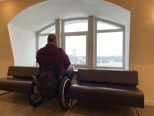 "Нормальный пандус, под правильным углом. Из-за снега немного сложно забираться", — майор спецназа "Тайфун" Николай Евтух уверенно крутит ко входу отеля "Виктория" в самом центре Выборга. Рядом с ним трое местных и тоже на колясках — они познакомились в реабилитационном центре под Петербургом. Четверку позвали проэкзаменовать первый в городе номер для непростых туристов.