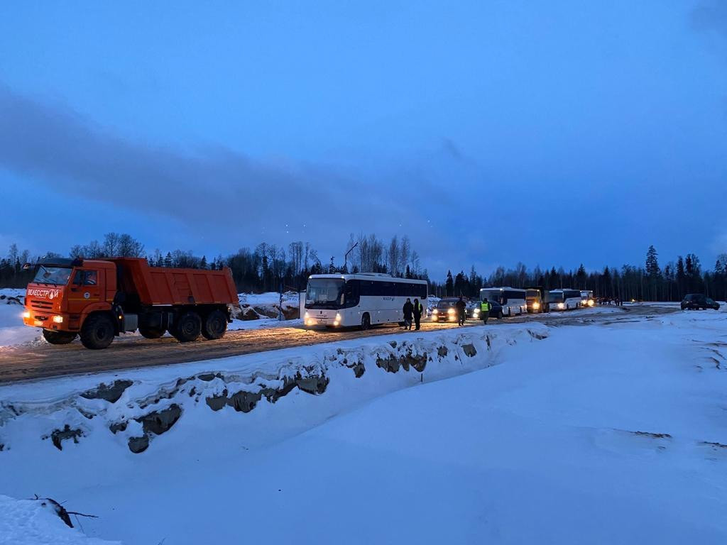 На месте сразу образовалась пробка из автобусов с рабочими, грузовиков, бензовозов, тралов с техникой, легковых машин.