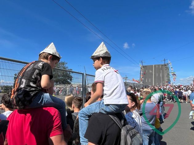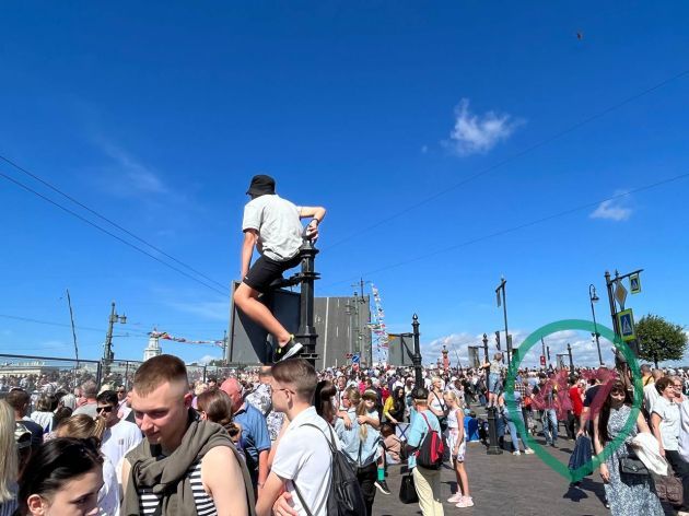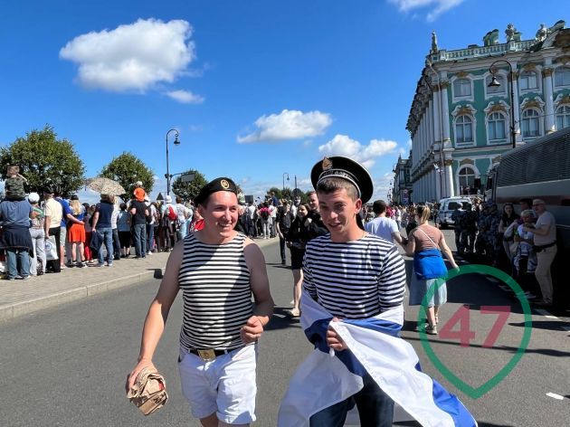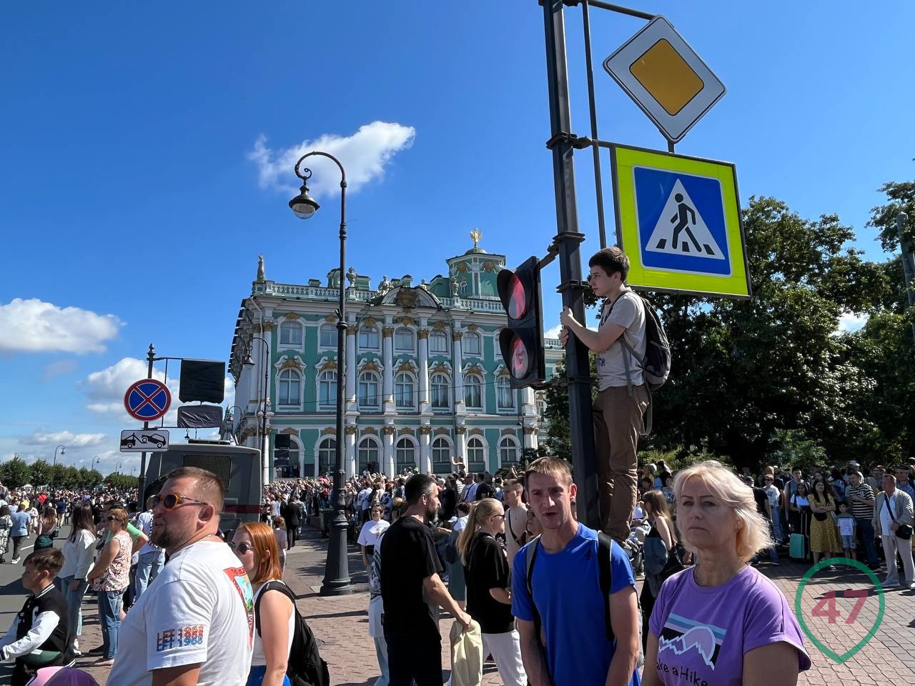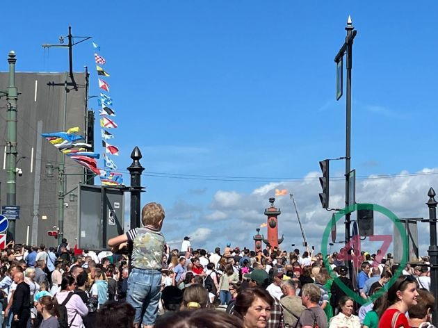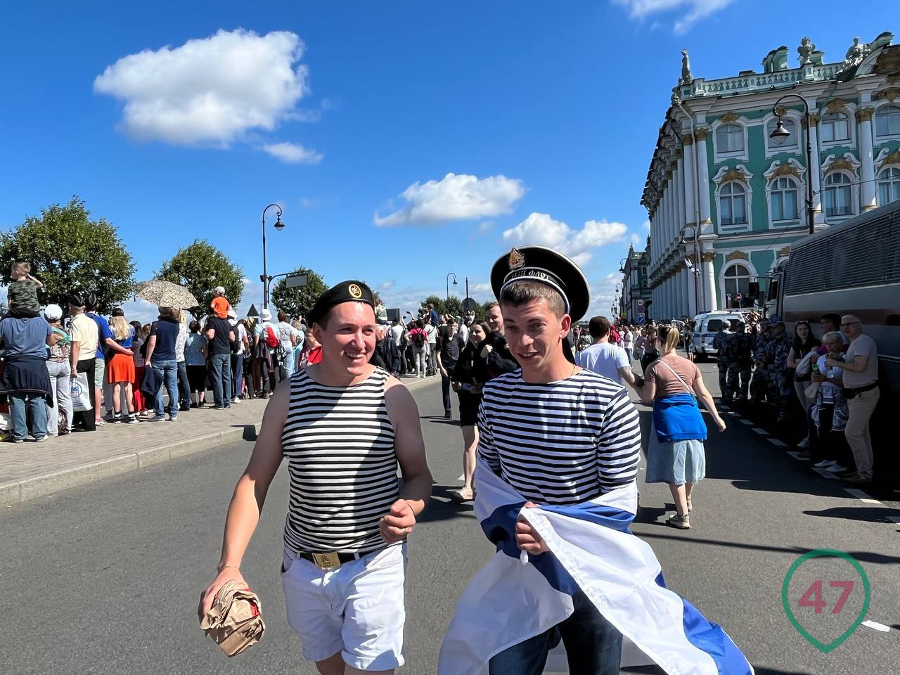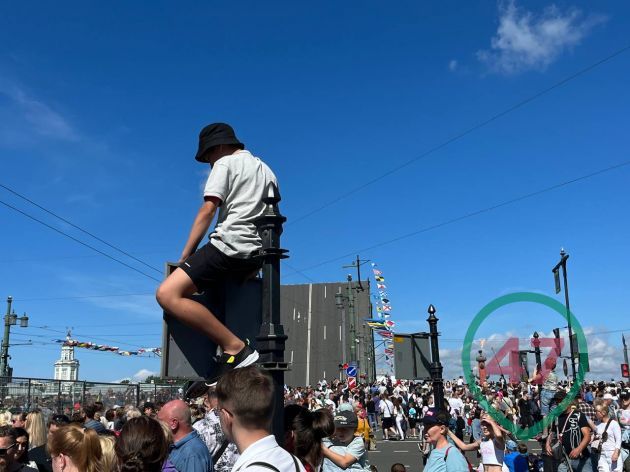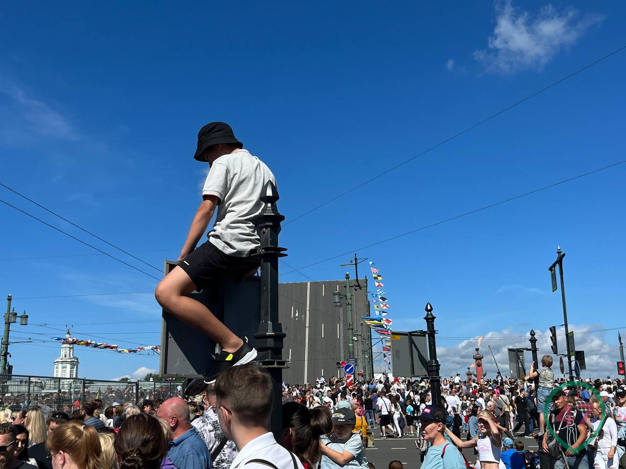 Корреспондент 47news утром 30 июля оказался среди зрителей Главного военно-морского парада ко Дню ВМФ. Толпа собралась на Дворцовой набережной, у здания Эрмитажа. Дети наблюдали за проходом военных моряков, сидя на шеях родителей в панамах, сложенных "корабликом" из газет. Один из самых находчивых вскарабкался на столб.