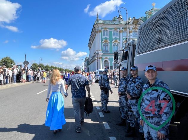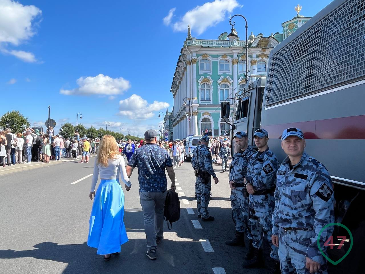 За порядком во время праздника наблюдают наряды Росгвардии. В толпе моряки выделяются своими тельняшками, бескозырками и добрыми улыбками.