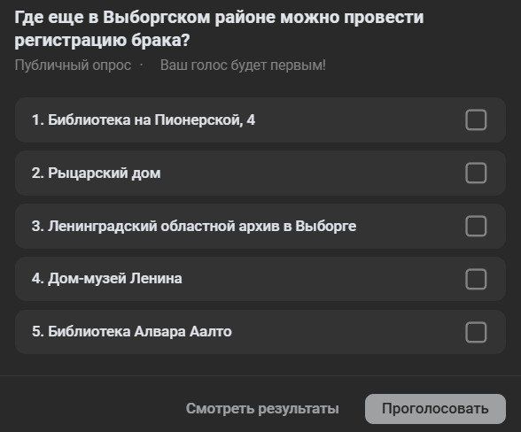 "Какие, на ваш взгляд, еще локации в Выборгском районе смогли бы подарить молодоженам яркие воспоминания и незабываемую атмосферу? Выберите варианты в опросе или предложите свой в комментариях", – обращаются власти муниципалитета, ссылаясь на поручение губернатора увеличить долю выездных регистраций.