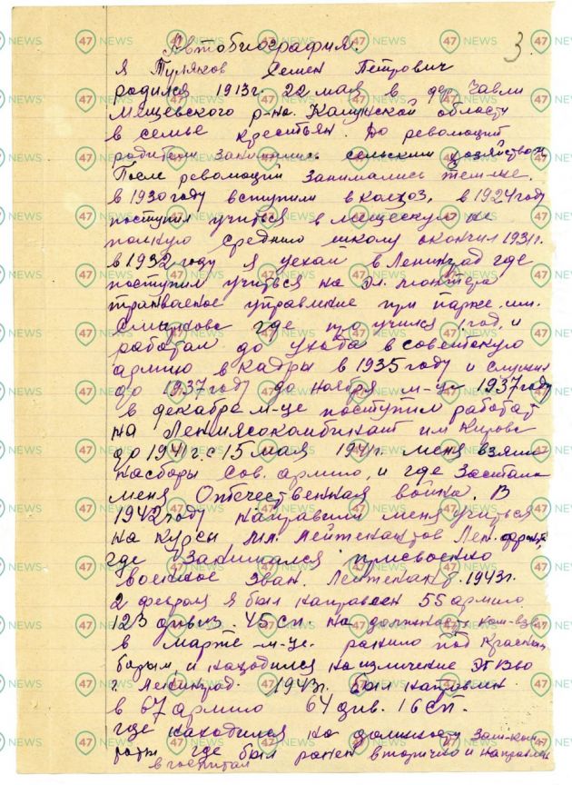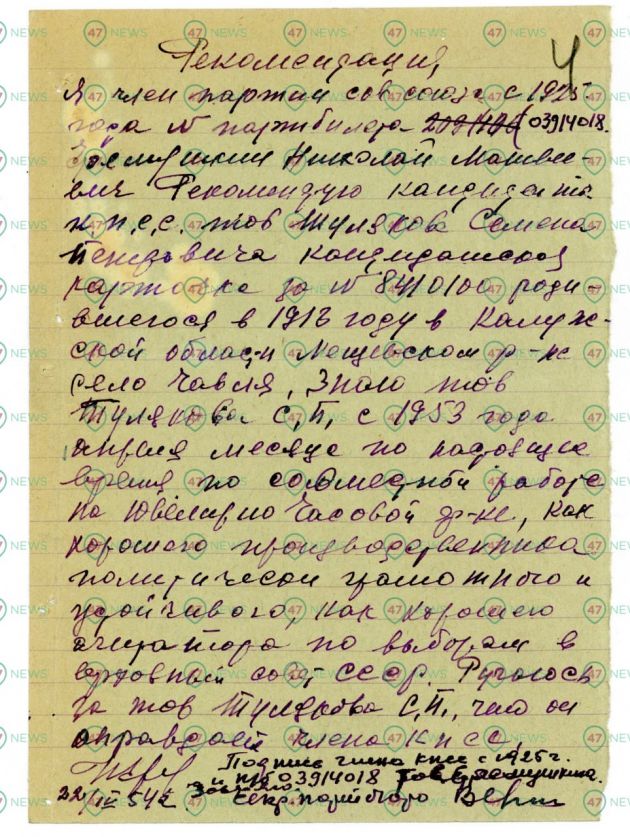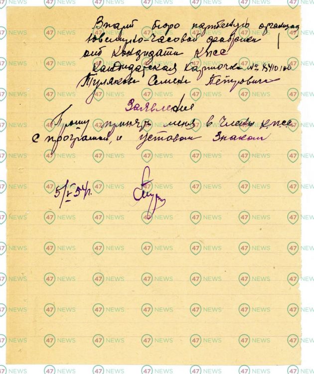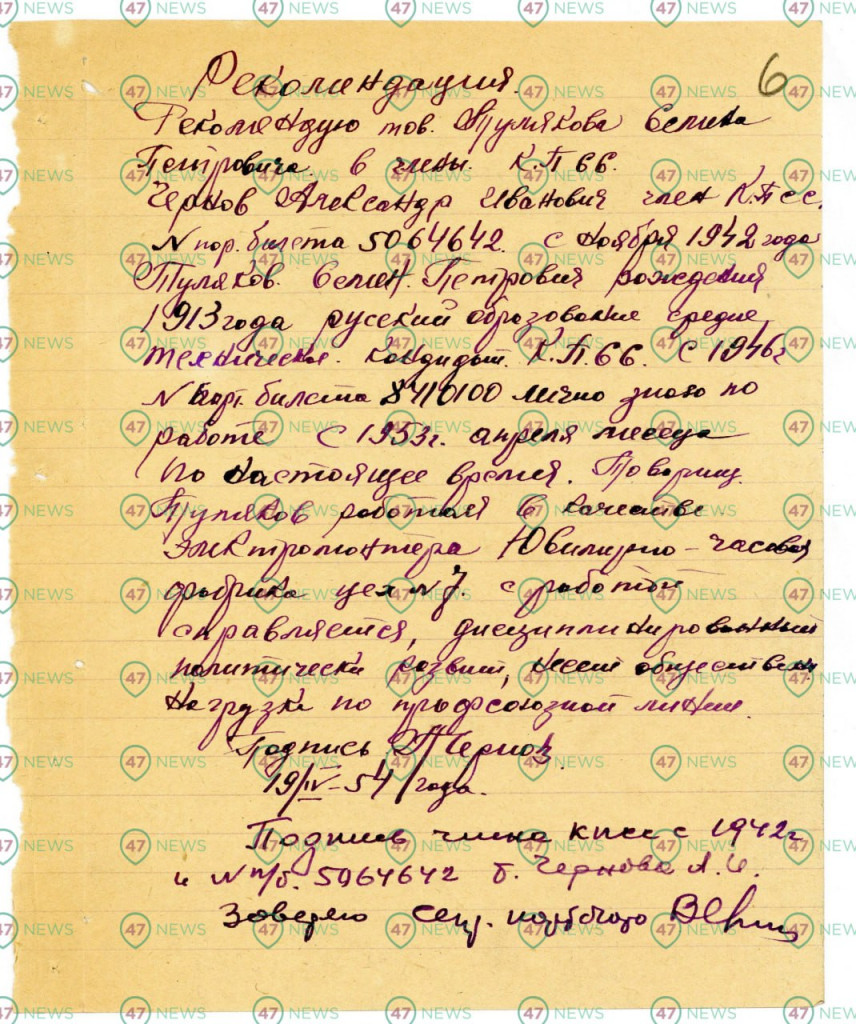 А пока товарищи Ерёмушкин, Жук и Чернов ответственно ручаются, что их 40-летний коллега - фабричный электромонтёр Семён Туляков - будет настоящим коммунистом. Сам Семён на двух листах пишет автобиографию. Такие правила. Вот эти листы из 1954 года. 47news оставил ту часть, где про подвиги. В них и про Финскую, и про Великую Отечественную, и про ранения. А прежде - про переезд бывшего крестьянина в Ленинград. Всё совпало, в том числе и деревня Чавля, но только она не под Смоленском, как у Минобороны, а под Калугой. Павел, если решишь проехаться по земле, откуда ты вырос, не перепутай.