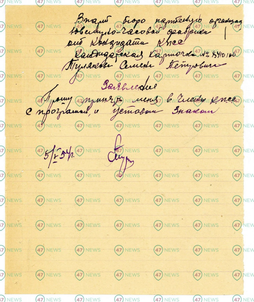 Электромонтёр и фронтовик Туляков С. П., 1913 года рождения, из деревни Чавля обнаружил себя в гальваническом цеху Ленинградской ювелирно-часовой фабрики. В нашем 2025 году ЛЮЧФ - это тот весёлый угол Гостиного Двора, что выходит на тусовочную Думскую улицу. А в послевоенных мастерских там из старых украшений могли вылить новые. Рабочий человек и уже не парень Семён был кандидатом в члены партии и хотел стать, что логично, её полноправным членом.