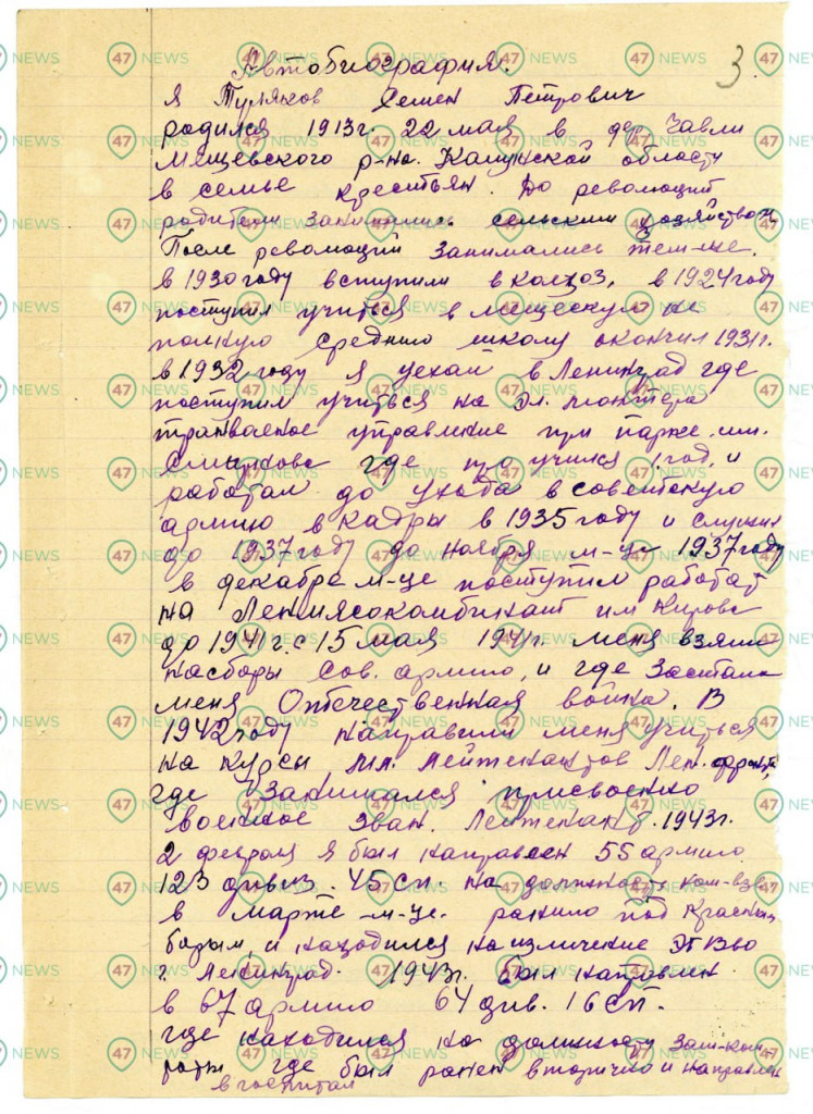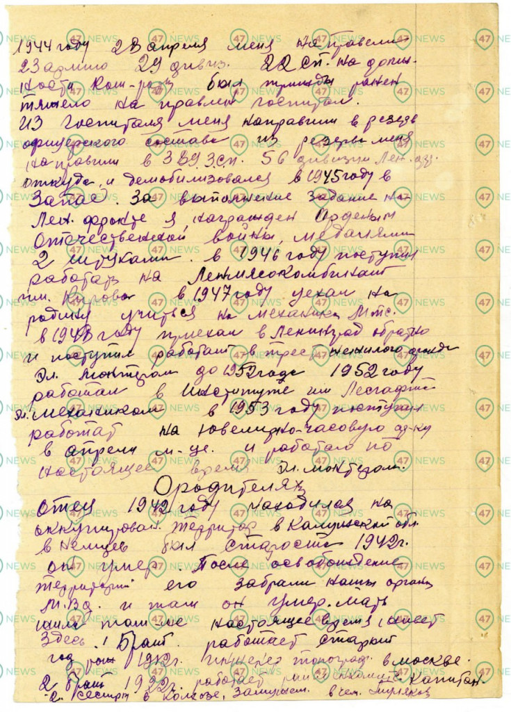 "15 мая 1941 года меня взяли на сборы в Сов. армию, и где застала меня Отечественная война… На должности командира был трижды ранен тяжело. Направлен в госпиталь. Из госпиталя меня направили в резерв офицерского состава… За выполненные задания на Лен. фронте я награждён Орденом Отечественной войны, медалями 2 штуками", - своей рукой выводит будущий дед Павла Дурова.