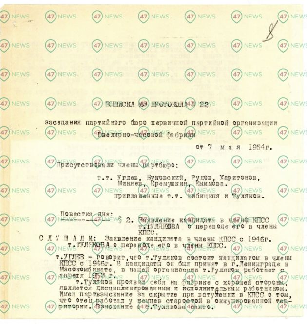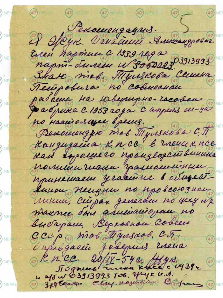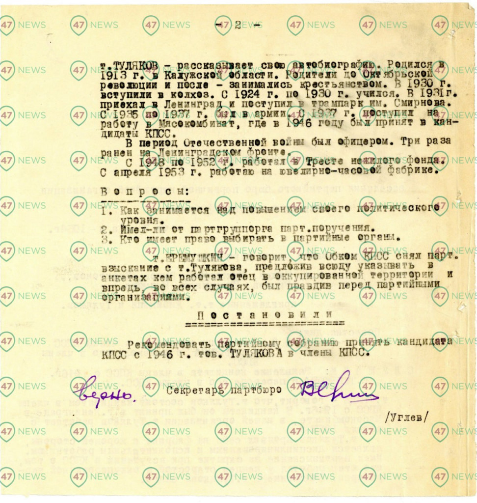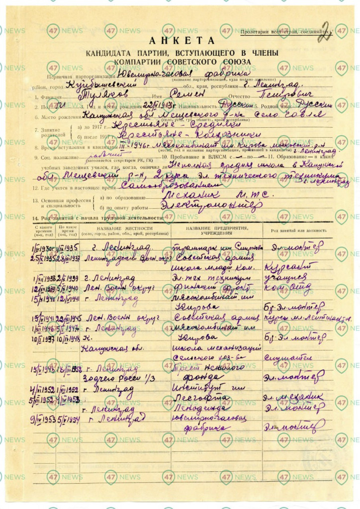 Если нагрудный карман вашего ленинградского предка грел красный билет члена КПСС, то тут к гадалке не ходи, а иди в архив историко-политических документов Петербурга. Корреспондент 47news так и поступил. Поскольку электромонтёр Туляков не сделал большой политической карьеры, то и дело его не под грифом секретно - хоть учитайся.