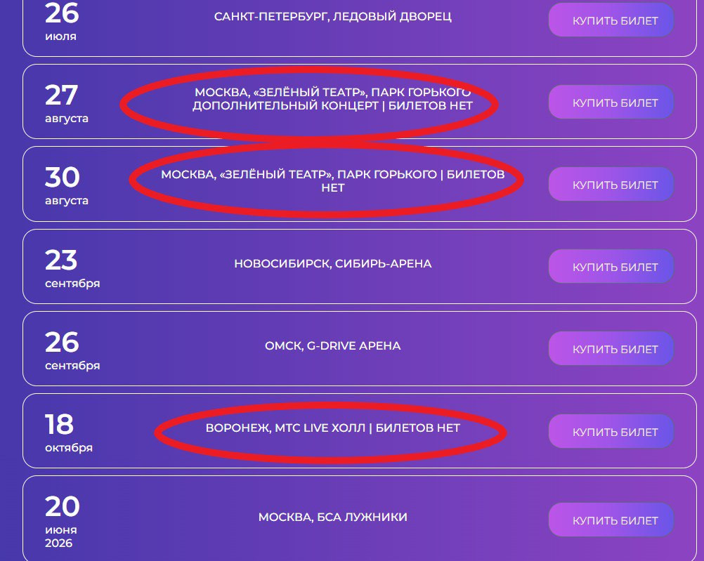 Сейчас афиша на официальном сайте певицы сообщает, что в августе будет два концерта в Москве, билетов уже нет, как и на выступление в Воронеже 18 октября. 26 июля будет концерт в Ледовом дворце Петербурга, попасть пока можно, билеты от 5-ти до 400 тысяч рублей. На момент публикации, судя по схеме зала, количество мест стремительно убывало.