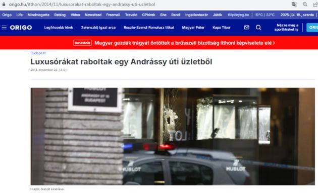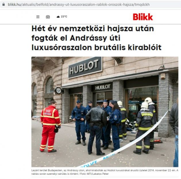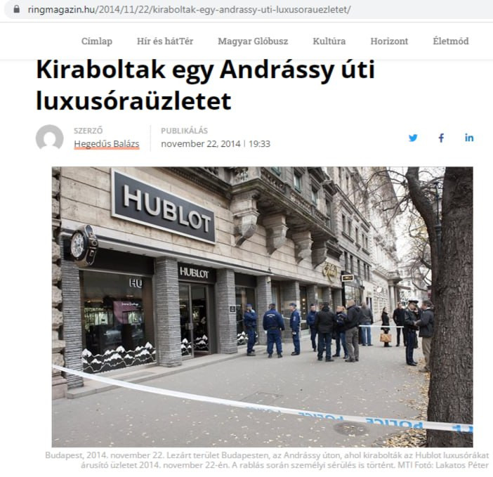 Дело об ограблении шикарного часового магазина на улице Андраши прекрасно известно в Венгрии. Хронику событий легко отследить и по официальным пресс-релизам "Мадьяр Рендёрсег", и по материалам местной прессы — от заметок-новостей до судебных репортажей. "Дело десятилетия", "Грабители не скрывали своих лиц", "Преступники не боялись быть пойманными". Так венгерские коллеги 47news писали 22 ноября 2014 года о налёте на бутик не для всех.
