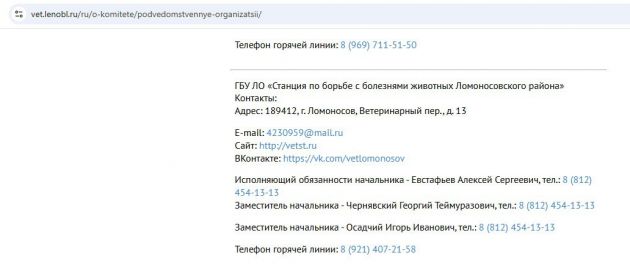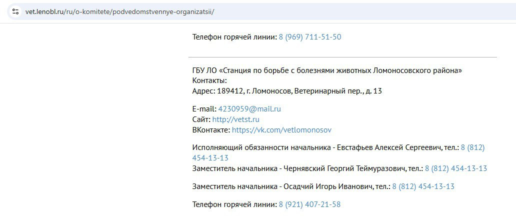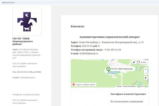 Человек по имени Алексей Евстафьев указан исполняющим обязанности начальника Станции по борьбе с болезнями животных Ломоносовского района на сайте учреждения и на сайте управления ветеринарии. Это подведомственная управлению структура.