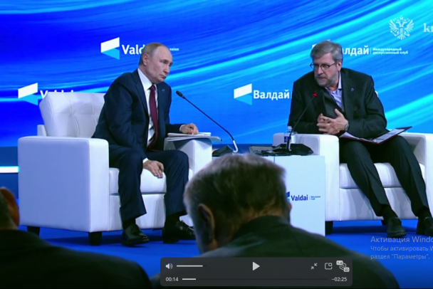 В начале разговора модератор сессии, журналист Федор Лукьянов, рассуждая о ситуации в современном мироустройстве и о возросшей ответственности политиков, задал российском лидеру вопрос, не ощущает ли он себя императором Александром I на Венском конгрессе.