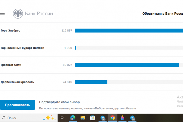 На момент написания новости, на сайте ЦБ свыше 80 тысяч голосов было отдано за Грозный-сити. Он занимает второе место. Пока что на первом с 113 тысячами голосов — гора Эльбрус.