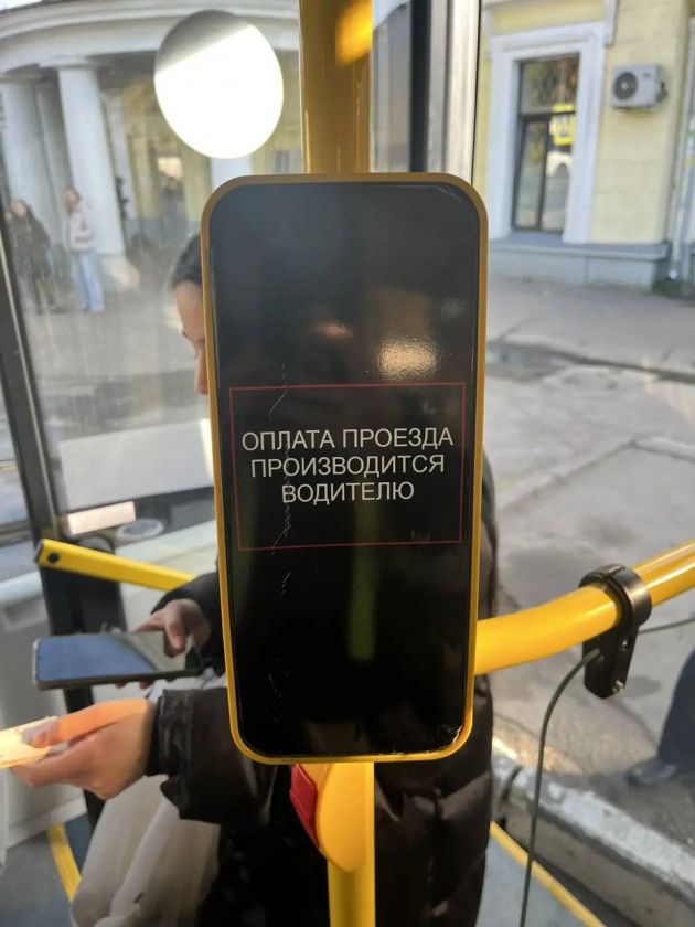 Помимо этого, на камеру попал неработающий валидатор с надписью: "Оплату проезда принимает водитель".