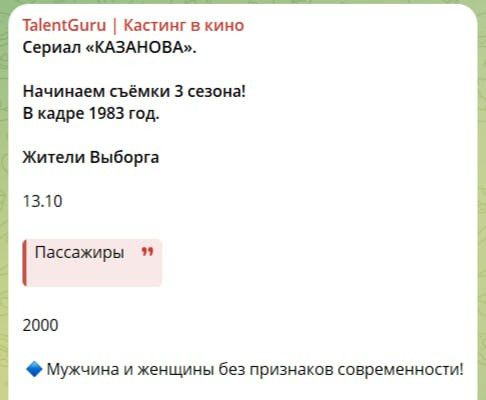 Поскольку согласно сценарию третьего сезона "Казановы" события разворачиваются в 1983 году, для массовки нужны выборжцы без признаков современности, то есть без пирсинга и татуировок на видимых частях тела.