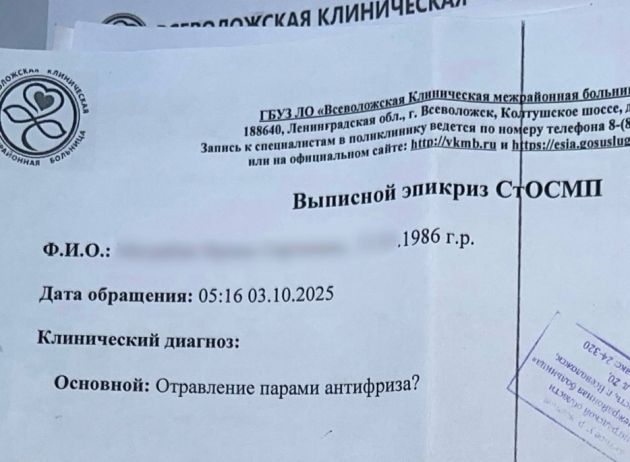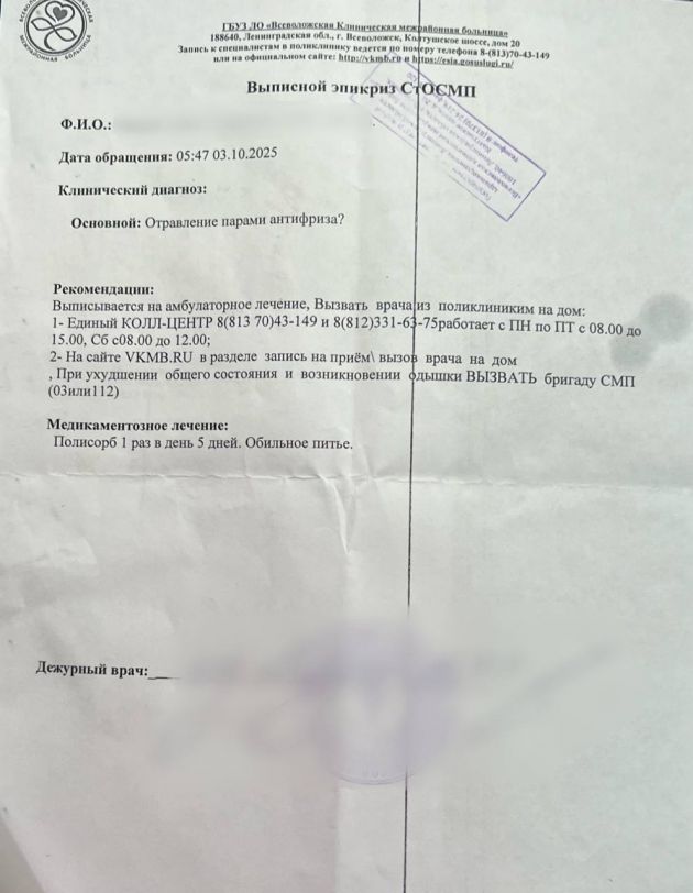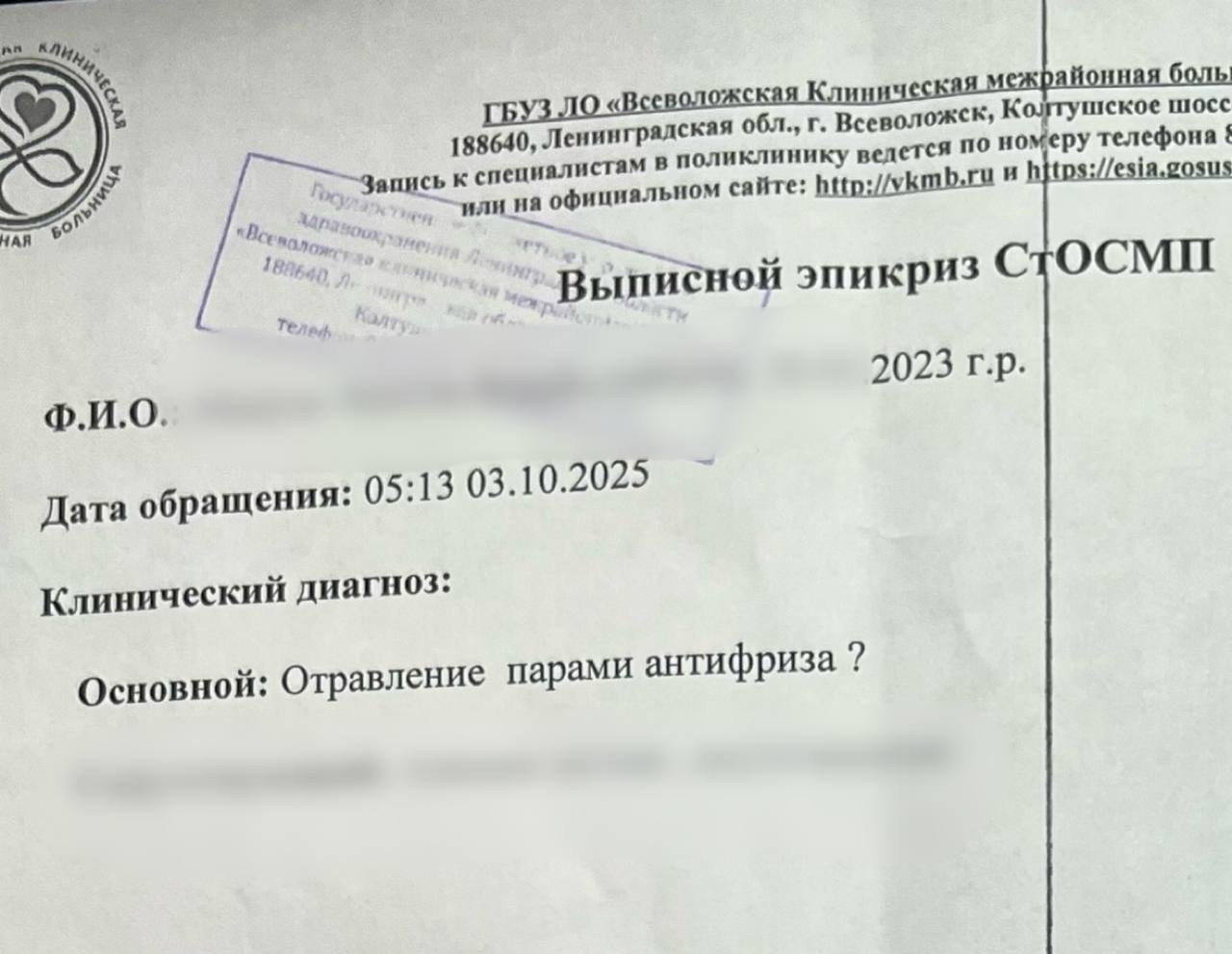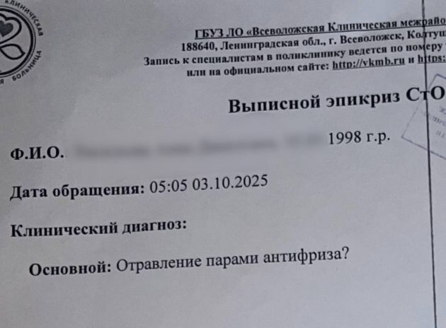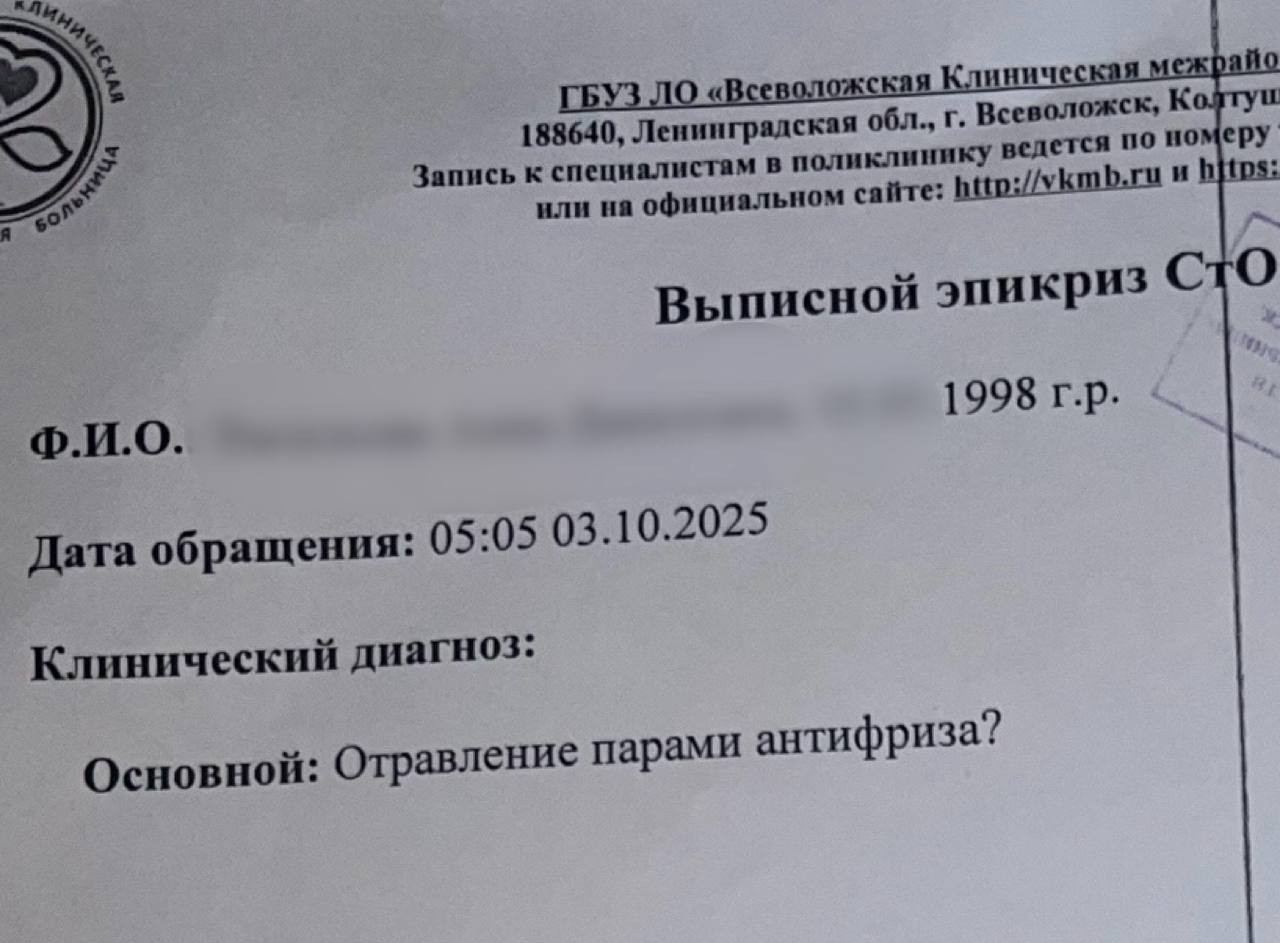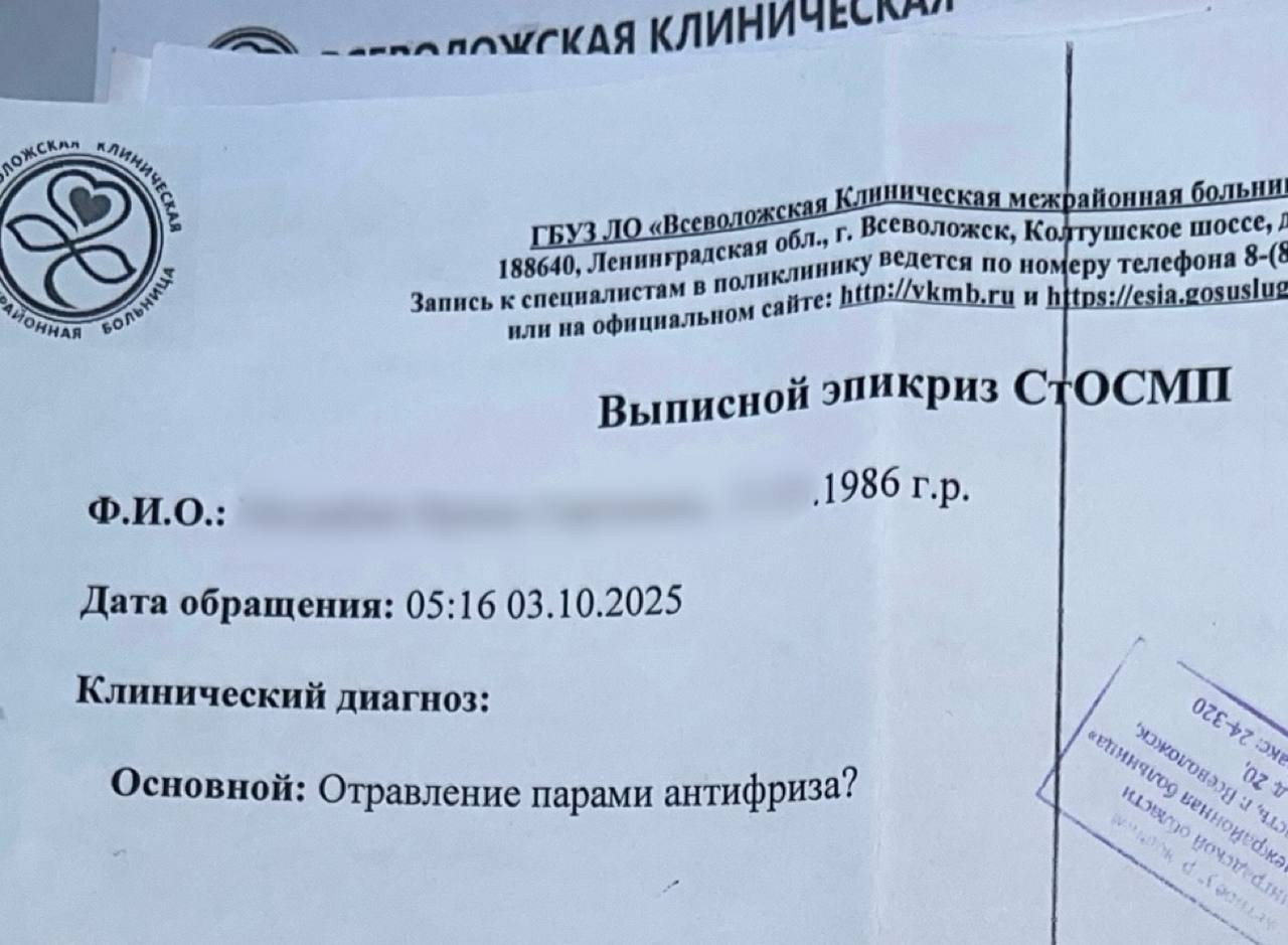 В итоге всех шестерых, включая соседку, уже утром 4 октября доставили во Всеволожскую межрайонную больницу. Через два-три часа после оказания помощи их отпустили в удовлетворительном состоянии, сообщили 47news в больнице. В документах у всех – подозрение на отравление парами антифриза.