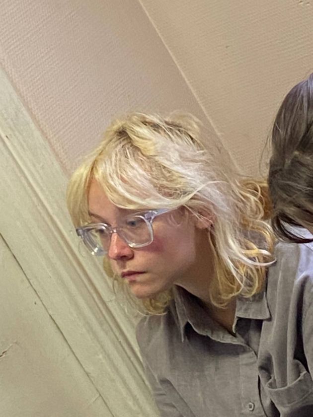 Перед тем, как пустили в зал, она показала в объектив "сердечко". Белокурые локоны прикрывают красные щеки, глаза - под очками с толстыми линзами. В целом создавалось ощущение, что нынешнего интереса журналистов она совсем не ожидала. Возможно, на общее настроение накладывалась ночь в ближайшем отделе полиции.