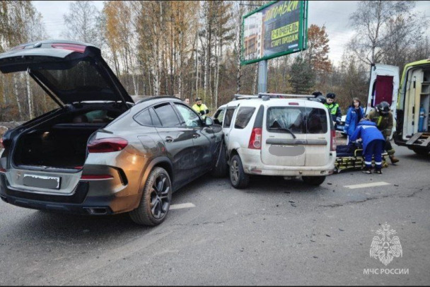 Столкнулись легковые автомобили BMW и Lada Largus. Травмы получил водитель отечественной машины. Судя по кадрам, удар пришелся именно в боковую часть этого автомобиля.
