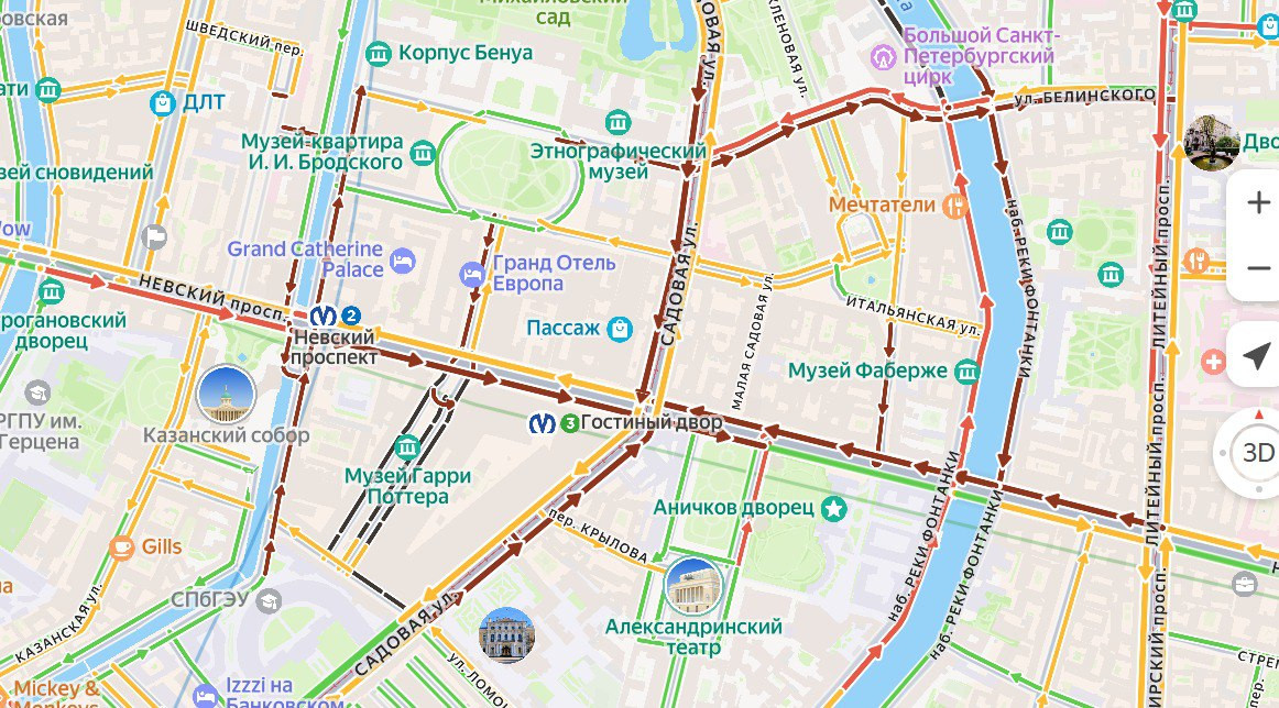 По данным сервиса "Яндекс Карты", вокруг Гостиного Двора сейчас наблюдаются серьезные пробки, дороги окрашены бордовым цветом. Заторы в обе стороны растянулись по Невскому проспекту от моста через Мойку и от Аничкова моста. Затруднены выезды на проспект с Садовой и Караванной.