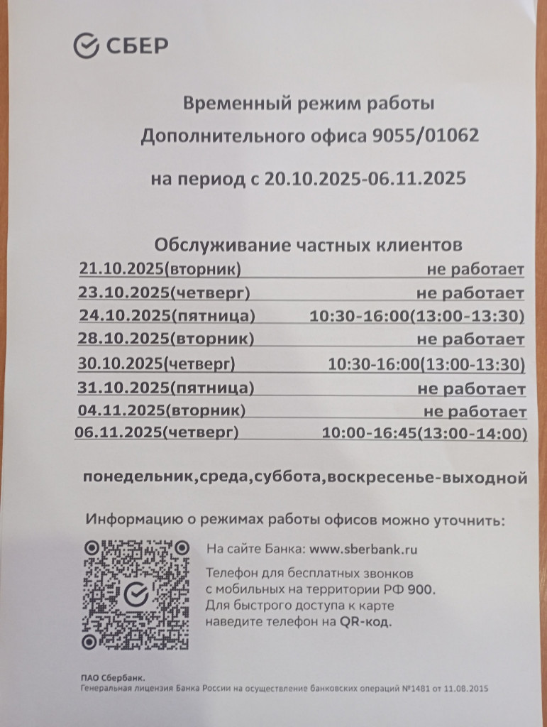 В пресс-службе Северо-Западного отделения Сбербанка 47news сообщили, что сокращенный режим работы офиса в Плодовом установлен временно: до 6 ноября, затем он вернется к своему обычному графику (ранее это было 3 дня в неделю, – прим. ред.).