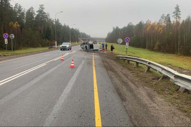 Устанавливаются обстоятельства аварии на федеральной трассе в Лужском районе Ленинградской области. Одна из столкнувшихся машин приземлилась на крышу.