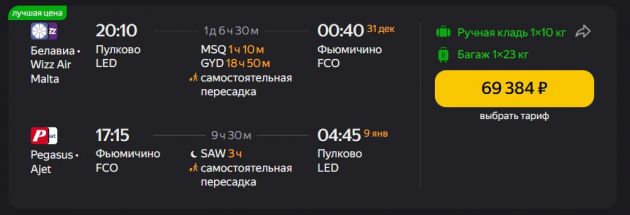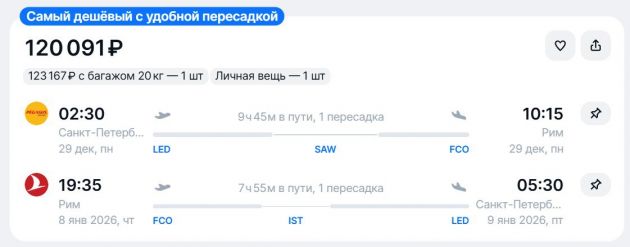 Билеты в Рим туда-обратно обойдутся в районе 70 тысяч рублей за человека. Из Петербурга самый выгодный вариант, который предлагали агрегаторы – это лететь с пересадками через Минск и Баку, а обратно – через Стамбул. Общее время в пути туда превысит 30 часов, а обратно – всего 9,5 часов. Но если выбирать более удобные стыковки, цены выше.