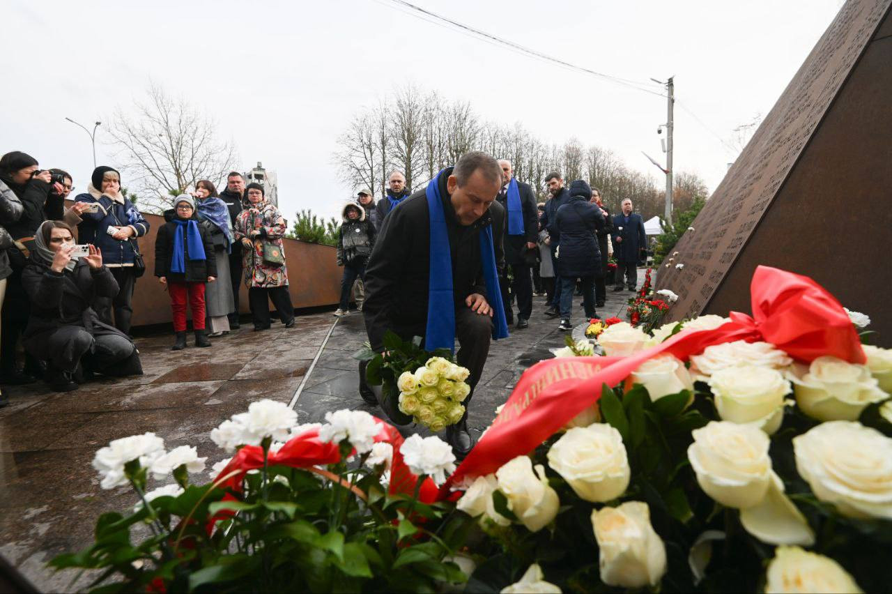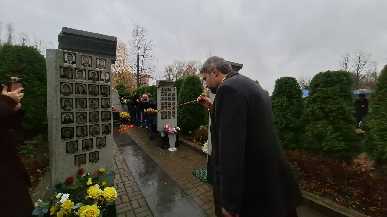 На Серафимовском кладбище у мемориала "Сложенные крылья" позже собрались родственники, друзья и близкие погибших, а также представители власти, чтобы возложить цветы к памятникам с именами жертв теракта.
