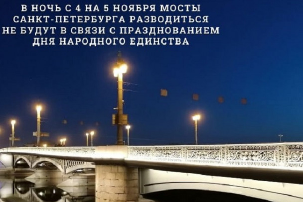 Как сообщает Telegram-канал комитета по развитию транспортной инфраструктуры Петербурга, в ночь с 4 на 5 ноября мосты в городе на Неве не будут разводиться по праздничной традиции.