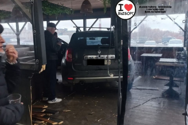 В террасу кафе в Выборге 3 ноября влетел автомобиль, - сообщают очевидцы в соцсетях. Судя по кадрам, "Рено Дастер" оказался внутри крытой деревянной террасы, аккурат между столиками, пробив дыру в противоположной стене и вытолкнув в него диванчик.