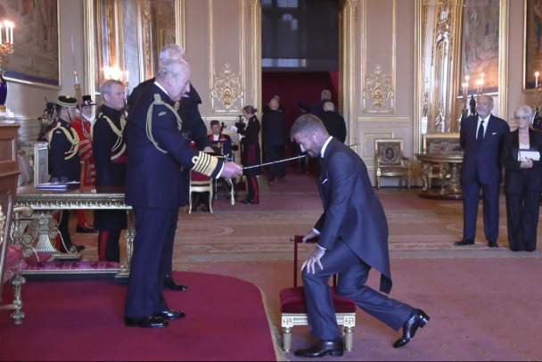 Британский король с помощью меча посвятил в рыцари популярного футболиста Дэвида Бекхэма.