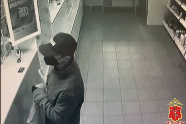Видно, что мужчина был в перчатках, черной медицинской маске и бейсболке. Он достал пистолет и направил в сторону сотрудницы. Затем с легкостью перепрыгнул через прилавок.
