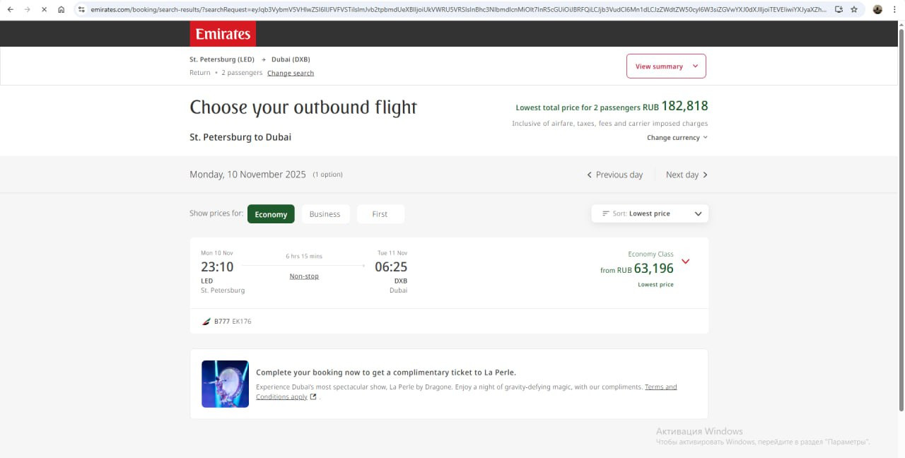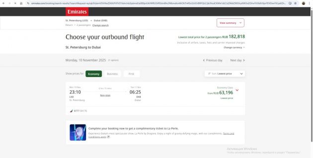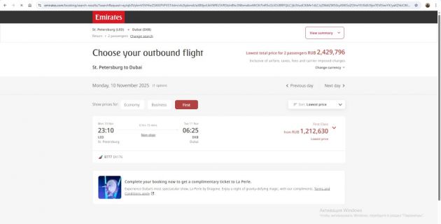 Из Петербурга в ОАЭ без пересадок летают самолеты "Аэрофлот" и Emirates. Стоимость примерно сопоставима: бизнес-класс на одного взрослого туда-обратно - 496363 рубля. В самолетах арабских авиалиний три класса, так что первый - 1124898 рублей, эконом - минимум 91409.