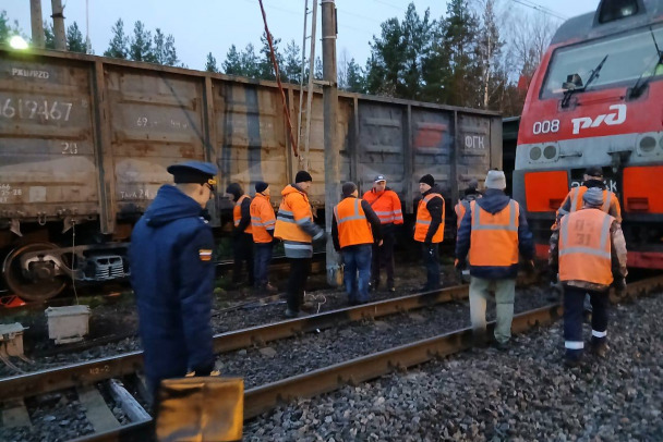 На месте схода грузовых вагонов с рельсов на станции Янега в Лодейнопольском районе Ленинградской области 10 ноября работает восстановительная бригада.