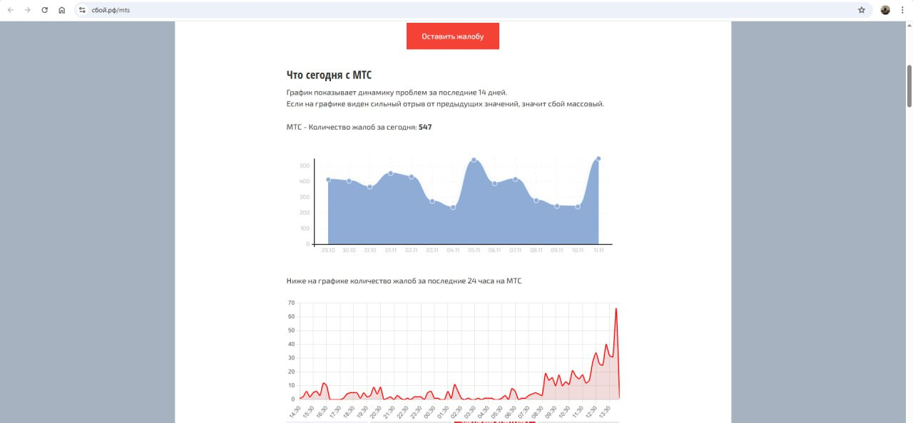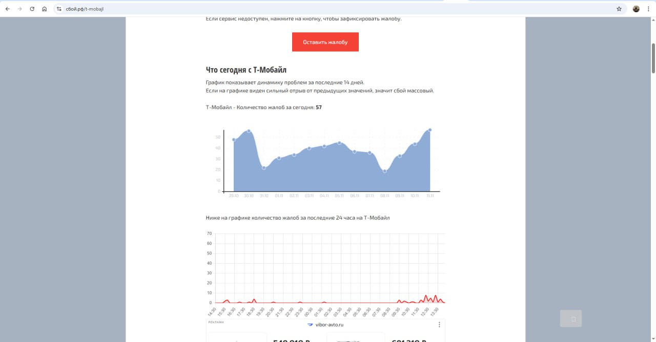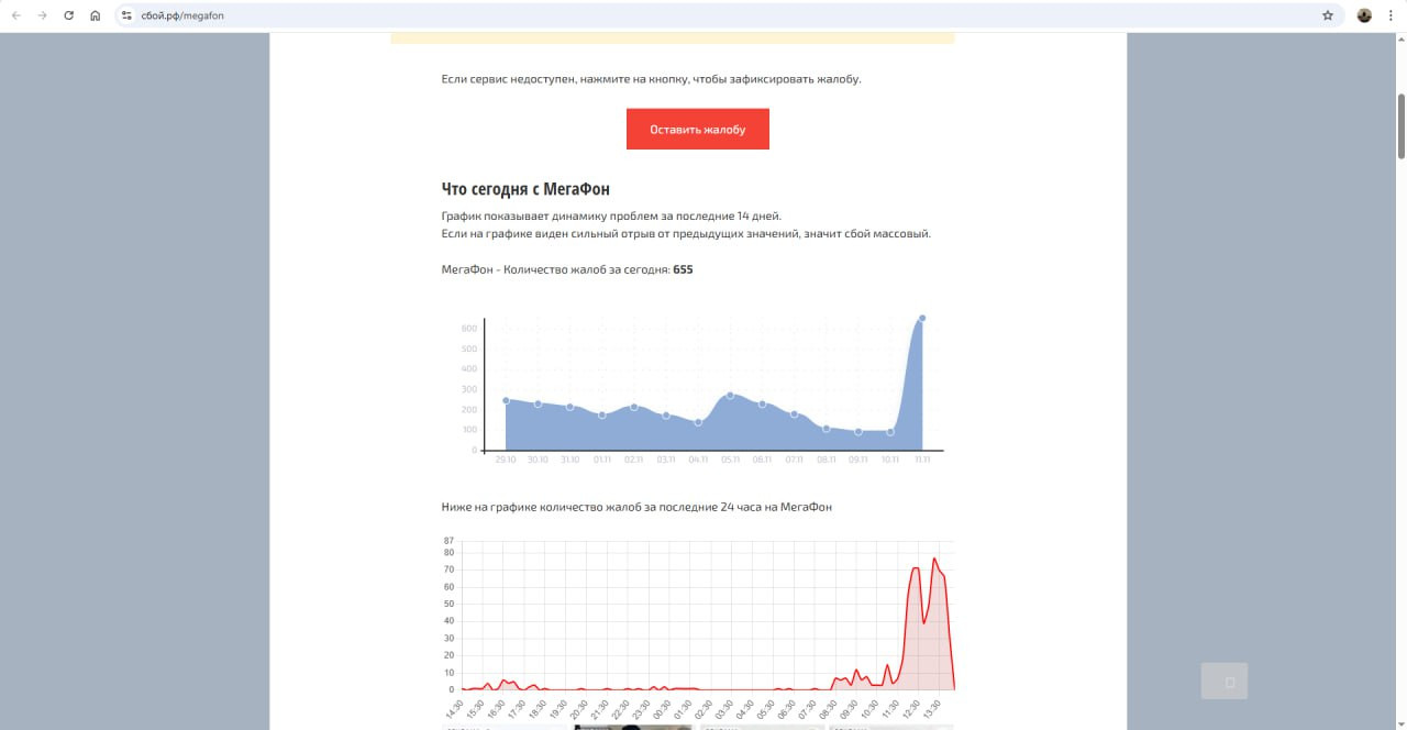 Судя по данным сайта Сбой.рф, 11 ноября график "Мегафона" вырос до точки в 655 негативных отзывов. При этом 52% заявок поступает именно из Петербурга. От клиентов МТС зафиксировано 547 обращений (18% из города на Неве). Меньше всего жалоб у клиентов "Т-мобайла", за сегодня у оператора 57 заявок. Зато 38% от них – от петербуржцев.