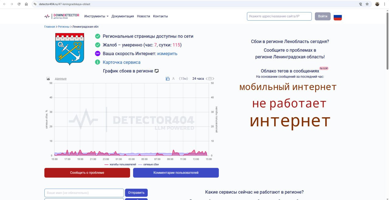 По информации сайта Downdetector, число жалоб на сбои в работе интернета в Ленинградской области на момент публикации считается "умеренным". За сутки от пользователей поступило только 115 заявок о проблемах с соединением.