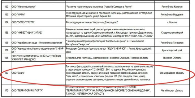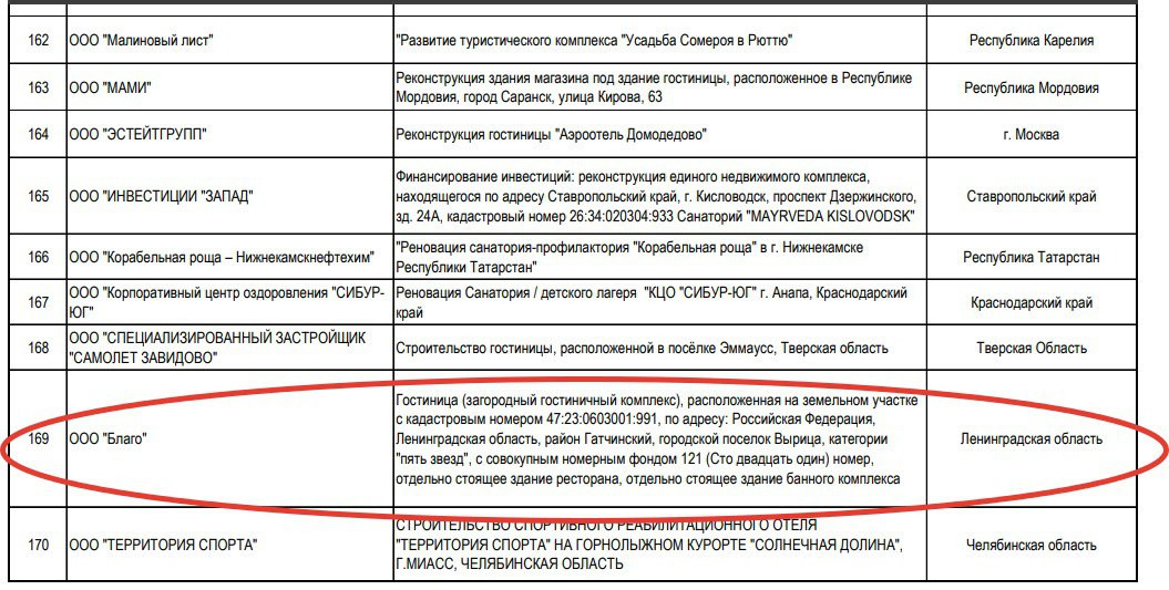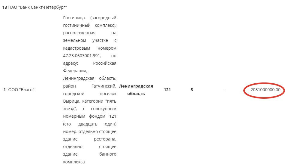 При этом данные про отель в Вырице есть на сайте Минэкономразвития РФ. В перечне заемщиков, прошедших в 2025 году отбор по программе льготного кредитования нацпроекта "Туризм и гостеприимство", названо ООО "Благо" с проектом загородного гостиничного комплекса. "С совокупным номерным фондом 121 номер, отдельно стоящее здание ресторана, отдельно стоящее здание банного комплекса", - есть в перечне. В приказе министерства фигурирует сумма займа в 2,08 миллиарда рублей от Банка Санкт-Петербург. По СПАРК, доли совладельцев "Блага" с 14 июля 2025-го в залоге у этого банка.