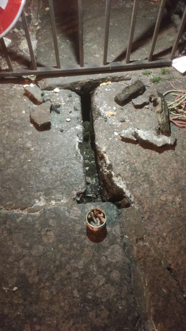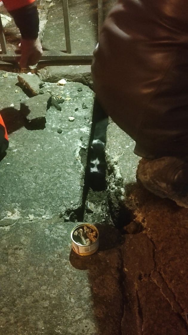 На месте волонтеры подвесили кошколовку. Пишут, что "стояли, переминаясь в ожидании, и вдруг услышали его мяуканье прямо перед собой". Заглянув внутрь щели между плитами, они смогли увидеть кота. Теперь осталось расширить щель, чтобы хвостатый смог вылезти на поверхность.