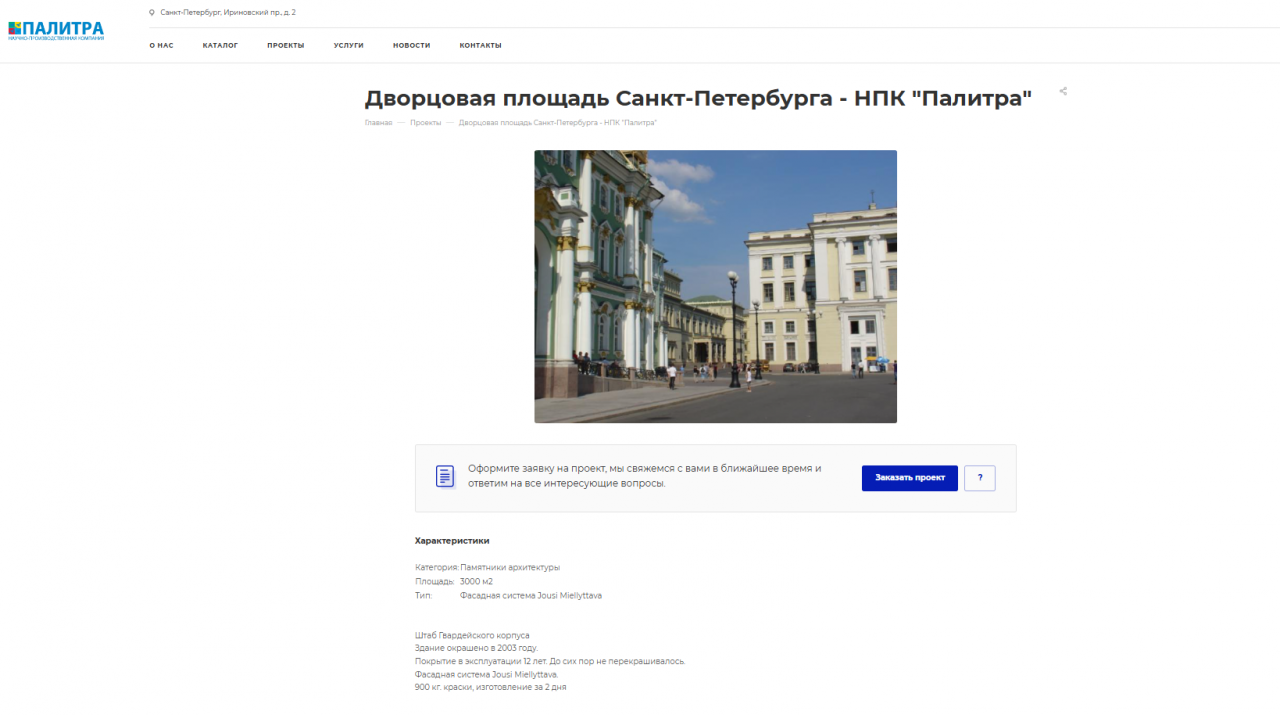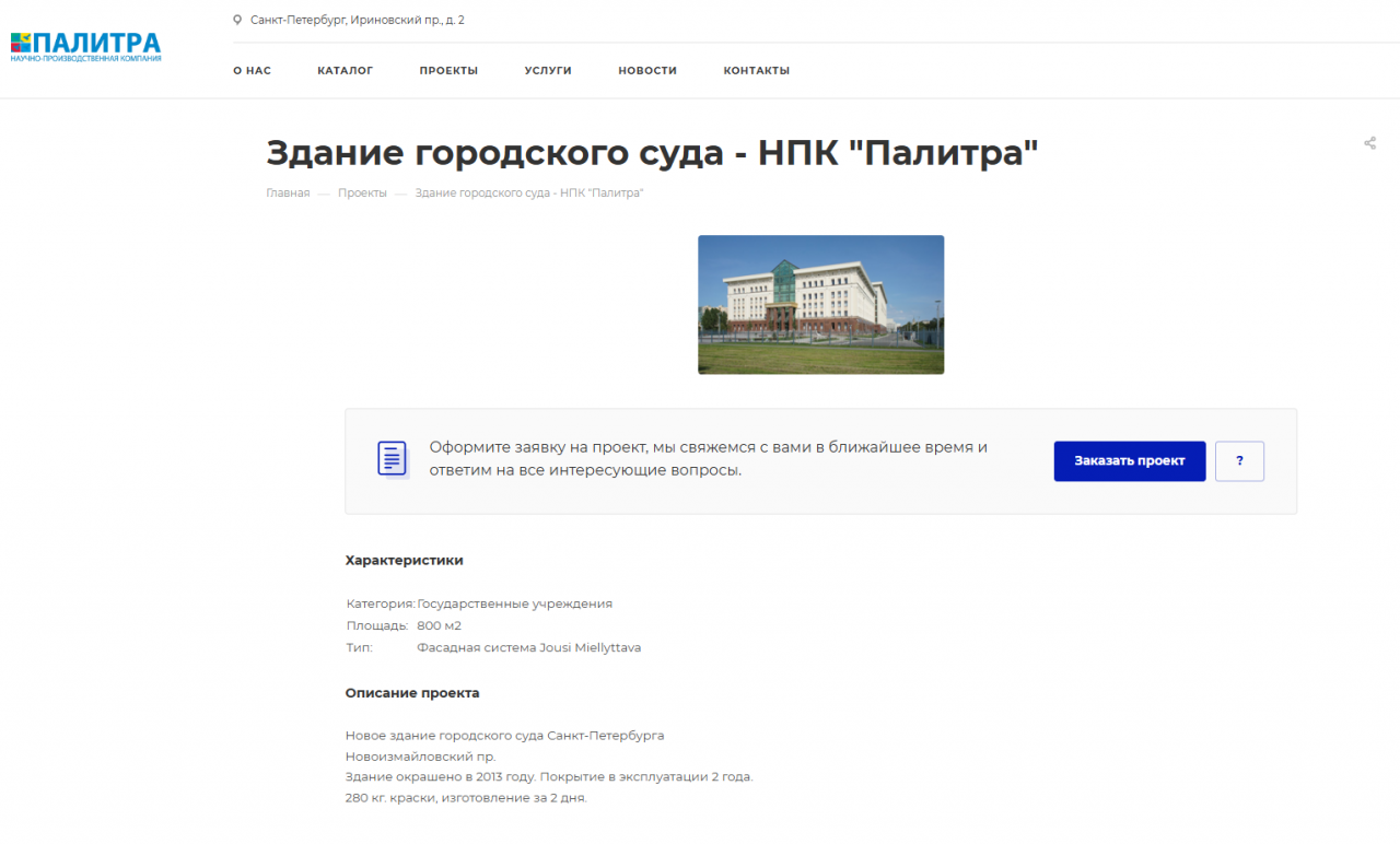 Также приводится портфолио производителя. В нем статусные здания Петербурга: штаб Гвардейского корпуса на Дворцовой площади и Санкт-Петербургский городской суд. Для первого в начале 2000-х завод выпустил 900 килограммов краски. Чтобы украсить 800 квадратов фасада в храме Фемиды в 2013-м, потребовалось 280.