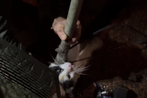 Судя по кадрам, животное удалось вытащить с помощью специального приспособления. Для кота процедура была не из приятных и он кричал.