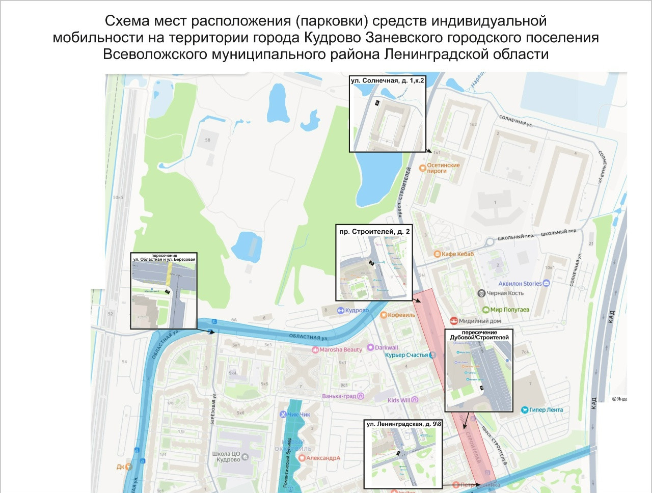 Как сообщает администрация Заневского городского поселения 14 ноября, в Кудрово утвердили схему мест парковки для СИМ, в том числе электросамокатов как арендных, так и частных, на территориях общего пользования.