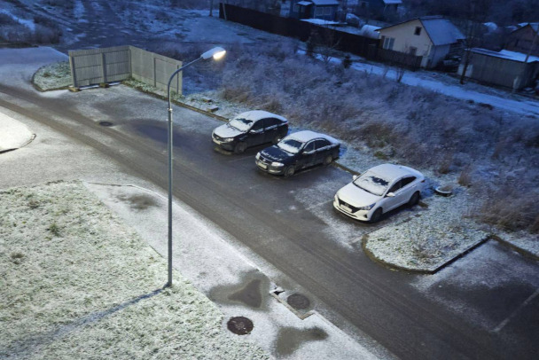 Снег падает на машины, тротуары и газоны в Кингисеппском районе Ленобласти. Осадки наблюдают и в местном порту.