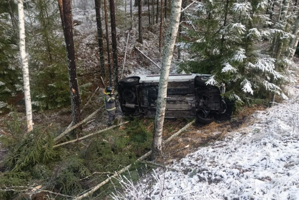 Дорожная авария случилась в Приозерском районе Ленобласти. Транспорт глубоко в кювете, водитель в больницу ехать не захотел.