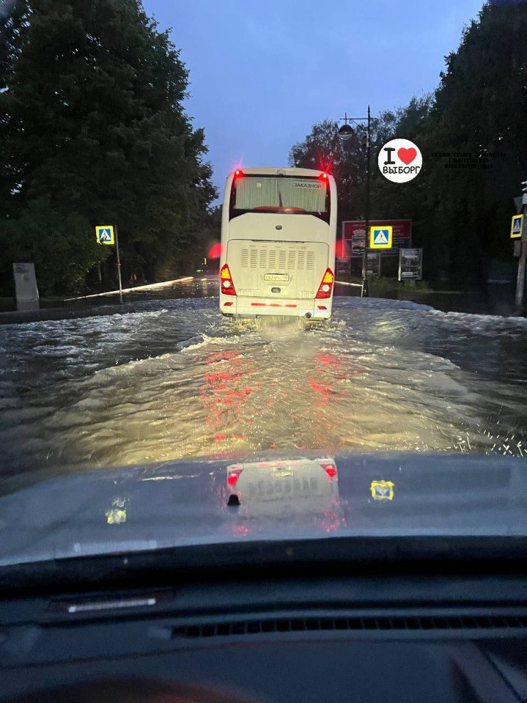Воскресный вечер для жителей Выборга прошел с потопом. Улицы заливало так, что проехать было тяжело. Рабочие Леноблводоканала устранили неполадки.