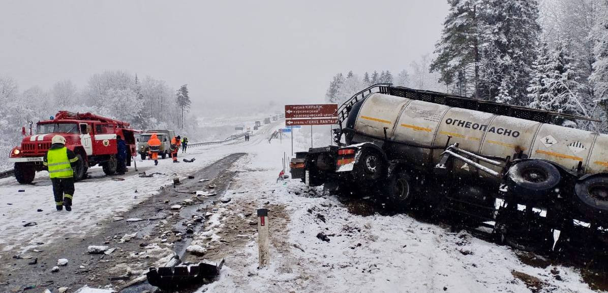Контейнеровоз, бензовоз и два легковых автомобиля столкнулись на федеральной дороге в Лахденпохском районе Карелии. Три человека погибли и столько же получили травмы.