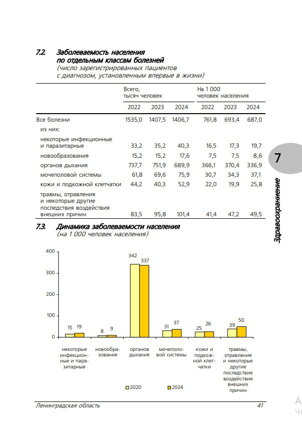 Наиболее заметный прирост за последние четыре года зафиксирован по числу травм и последствий внешних воздействий. За четыре года количество случаев увеличилось с 39 до 50. Среди заболевших на 1 000 населения – примерно 50 человек. Чаще всего жители Ленобласти сообщают о болезнях органов дыхания. С 2020 года их количество достигло 337 случаев на 1 тысячу человек.