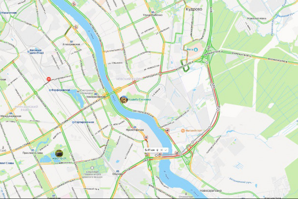 По данным сервиса "Яндекс Карты", днем 21 ноября на внутреннем кольце КАД, от вантового моста до Мурманского шоссе, образовалась пробка длиной больше 5 километров.