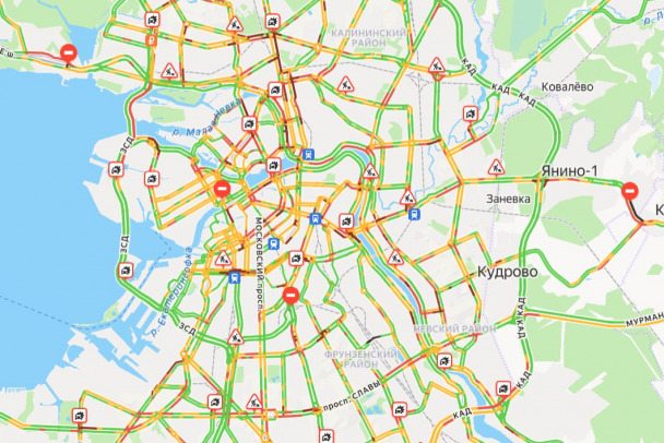 Большая часть заторов сосредоточена в Центральном, Адмиралтейском, Петроградском, Выборгском районах, некоторые из них связаны с авариями.